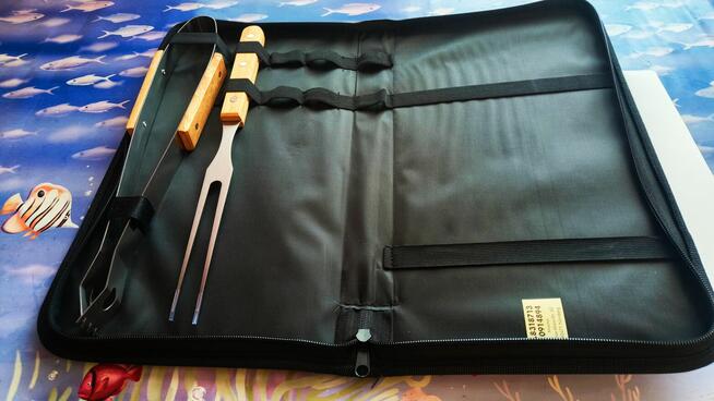 Zestaw, nowy, akcesoriów do grilla, w skład którego wchodzą m.in. szczypce, szpikulec.. Wysokiej jakości narzędzia ...