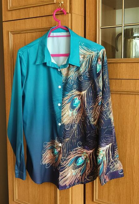 Multikolorowa nowa bluzka koszulowa. Wzory piór pawia. Długi rękaw, kołnierz, guziki. Rozmiar XXL, 95% poliester, 5% ...